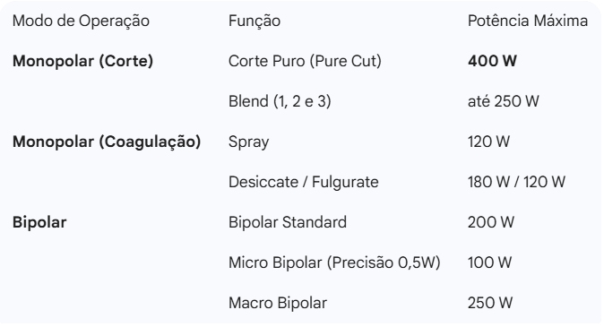 25 Modos de Cirurgia: Versatilidade total com 15 modos de corte, 5 de coagulação e 5 bipolares.