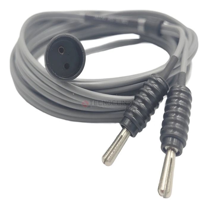 Conexão na Pinça (Universal): Na extremidade do instrumento, o cabo possui um conector moldado projetado para encaixar firmemente em Pinças Bipolares Padrão (Aquelas com 2 pinos metálicos expostos na traseira), sejam pinças modelo retas ou em baioneta.