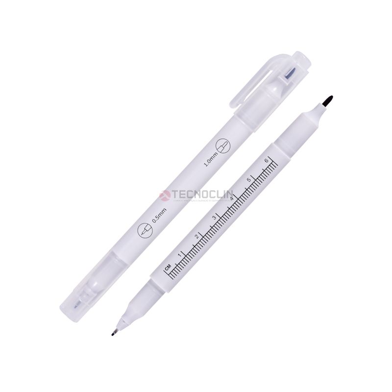 Caneta marcadora de pele, à base de tinta hipoalergênica (atóxica), resistente a líquidos (água, sangue entre outros) e de secagem rápida, na cor violeta (roxa). Possui ponta dupla (fina de 0,5 mm e grossa de 1,0 mm) na mesma caneta e uma régua extra flexível de 15 cm, estéril embalado em grau médico.