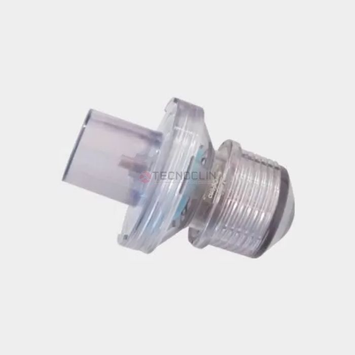 Válvula PEEP (Pressão Positiva Expiratória Final) em policarbonato (PC) e mola com carga ajustável de 5 a 20 cmH2O.