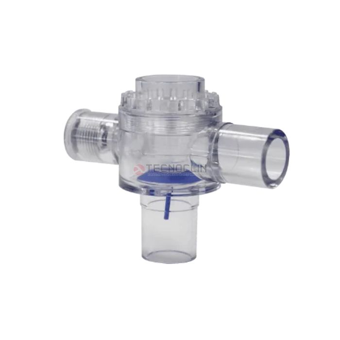A válvula unidirecional permite ventilação espontânea ou controlada, manual ou mecânica, com diafragma que impede a reinalação de gases.