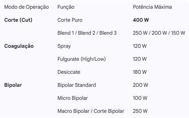 Versatilidade: Possui 25 modos de operação (15 de corte, 5 de coagulação e 5 bipolares).